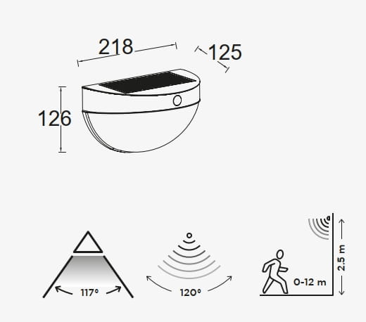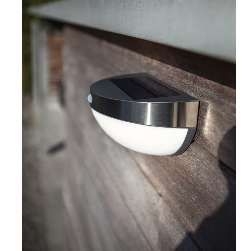 Kinkiet zasilany baterią solarną czerpiącą swoją energię z naturalnego źródła zasilania jakim jest światło słoneczne. Półkulisty kinkiet emituje biały naturalny strumień światła w barwie 4000K. Czujnik ruchu PIR jest idealnie wbudowany w pierścień wykonany ze stali nierdzewnej wychwytując cały ruch i zapewnia mocne światło za każdym razem, gdy ktoś przechodzi w mroku.