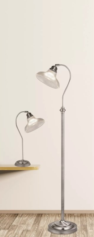 Dzięki satynowo-srebrnej podstawie i żłobkowanemu kloszowi z halofanu ta lampa podłogowa będzie idealnym wykończeniem każdego pomieszczenia.