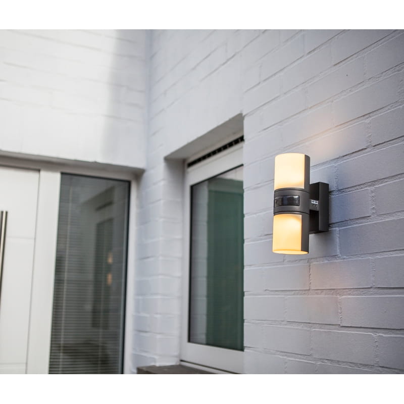 Kinkiet ścienny LED niemieckiego producenta oświetlenia Lutec wykonany jest na bazie walca z połączeniem antracytowej aluminiowej obudowy i mlecznego białego klosza. Dwie ruchome głowice oferują możliwość obrotu obu głowic niezależnie o 350 stopni, co daje przyjemny blask na elewacji lub przedni rozproszony strumień światła. Dodatkowo kinkiet jest wyposażony w czujnik ruchu PIR o zasięgu 12 metrów i kącie detekcji 180 stopni. Występuje również w wersji bez czujnika ruchu.