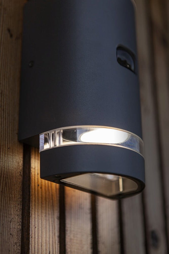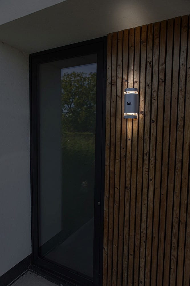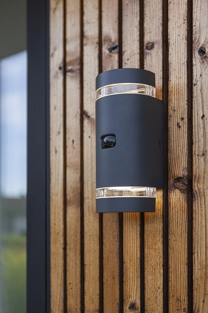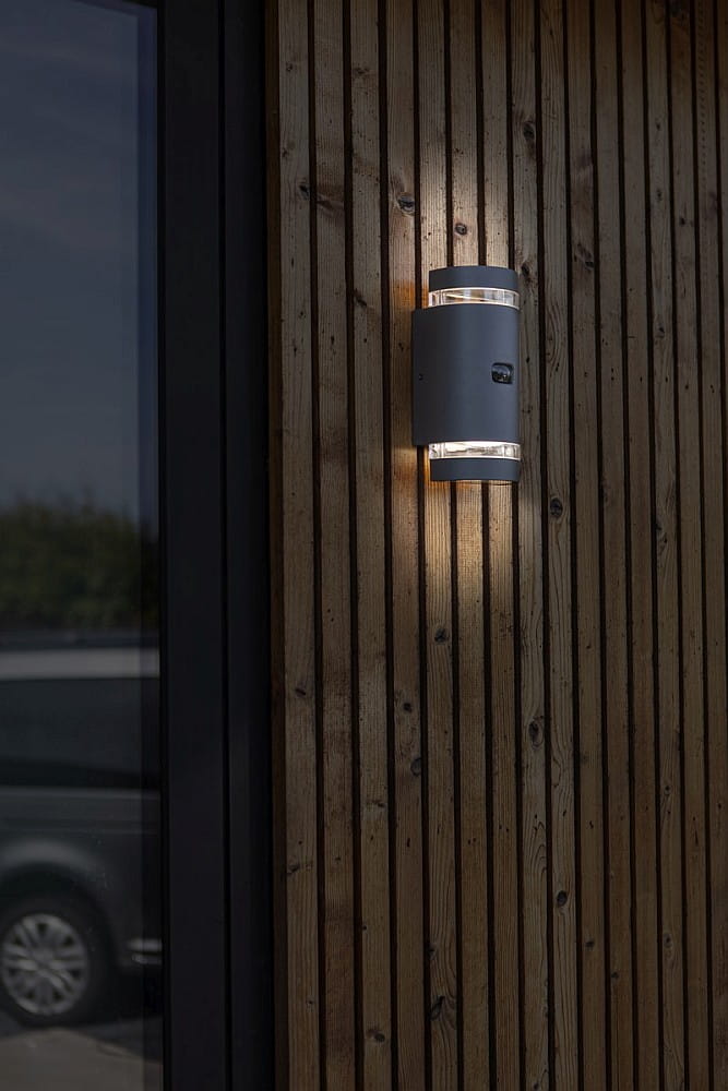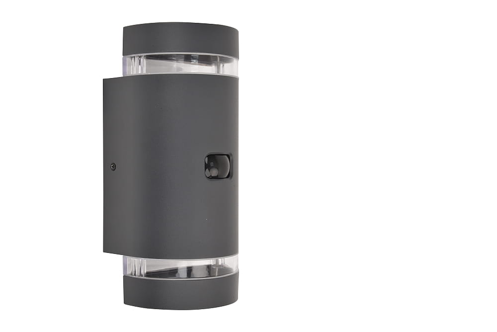 Modny projekt FOCUS. Zewnętrzna lampa ścienna LED Up & Down, teraz dostępny również z czujnikiem ruchu i zmierzchu. Czarny i kompaktowy czujnik PIR jest doskonale zintegrowany z antracytową obudową. Ręczna regulacja czasu i zmierzchu.