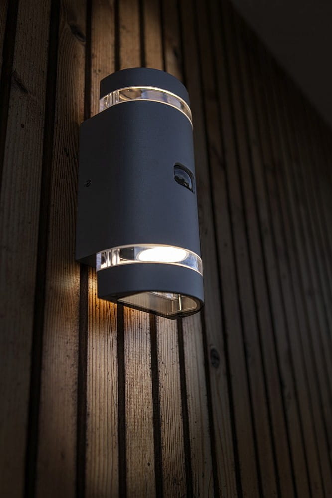 Kinkiet zewnętrzny góra-dół z czujnikiem ruchu i zmierzchu Focus antracyt PIR 2xGU10 IP44