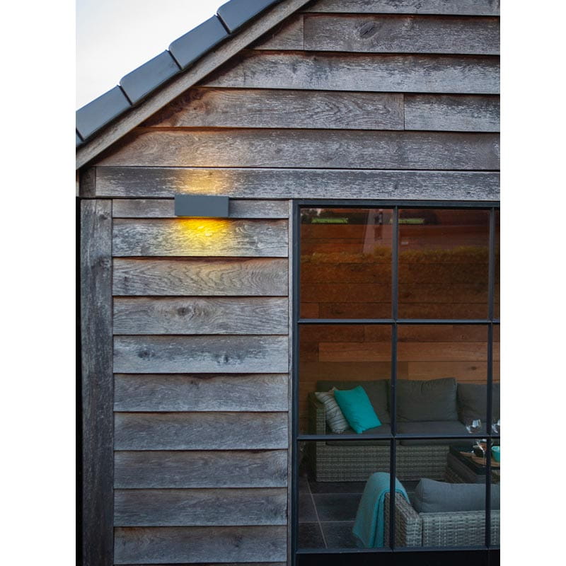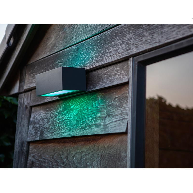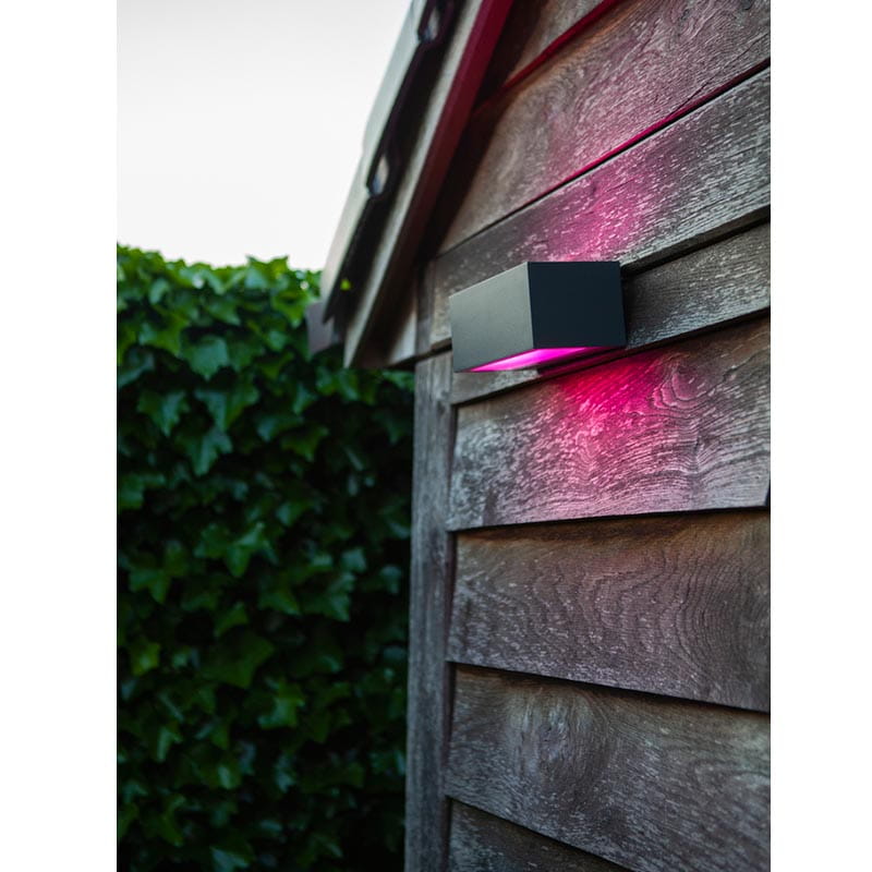 Kinkiet zewnętrzny GEMINI LED belgijskiej firmy Lutec wykonany jest z wysokiej jakości, odpornego na czynniki zewnętrzne odlewu aluminiowego w kolorze ciemnoszarego antracytu. Charakteryzuje się wysoką jakością wykonania oraz minimalistycznym designem. Ta elegancka lampa przypominająca swym wyglądem cegłę w antracytowym aluminium, świeci idealną wiązką światła w górę i dół. Kinkiet jest bardzo wygodny do montażu na elewacji. Dzięki wykonaniu z modułem oświetleniowym WIZ connected , wiązka światła stworzy wspaniały akcent w dwóch kierunkach w różnych barwach i kolorach. Sami zdecydujcie jaki kolor na ścianie będzie odpowiedni w danym momencie.