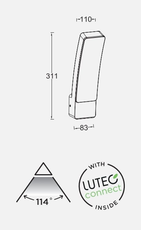 Zewnętrzna lampa ścienna LED KIRA z zakrzywionym i bezramkowym dyfuzorem. Dystrybuuje jednorodne białe światło, aby oświetlić ściany, ścieżki i inne otwarte przestrzenie wokół domu. Kolor ciemny szary. Produkt ściemnialny. Współpracuje z aplikacją Lutec Connect. Nie współpracuje z zewnętrznym ściemniaczem. Aby sterować oprawą z dowolnego miejsca za pośrednictwem internetu konieczne jest zastosowanie Acces Box.