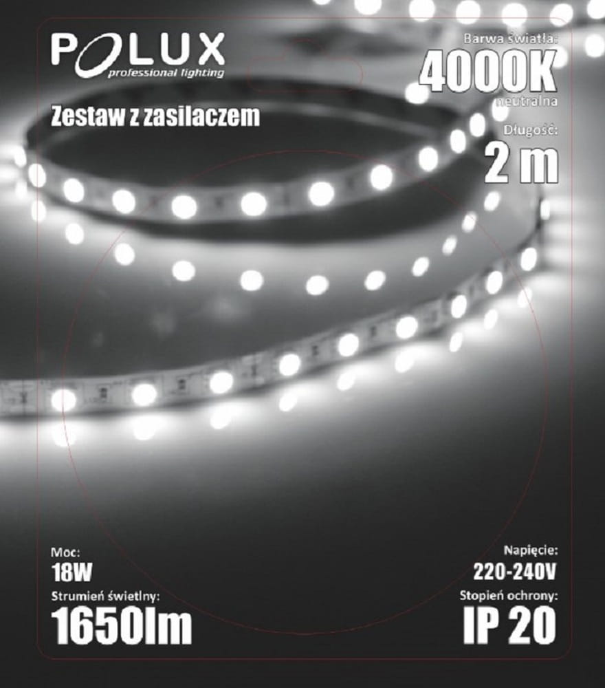 LED 2m. 12V 18W 4000K IP20 + zasilacz Zestaw taśma
