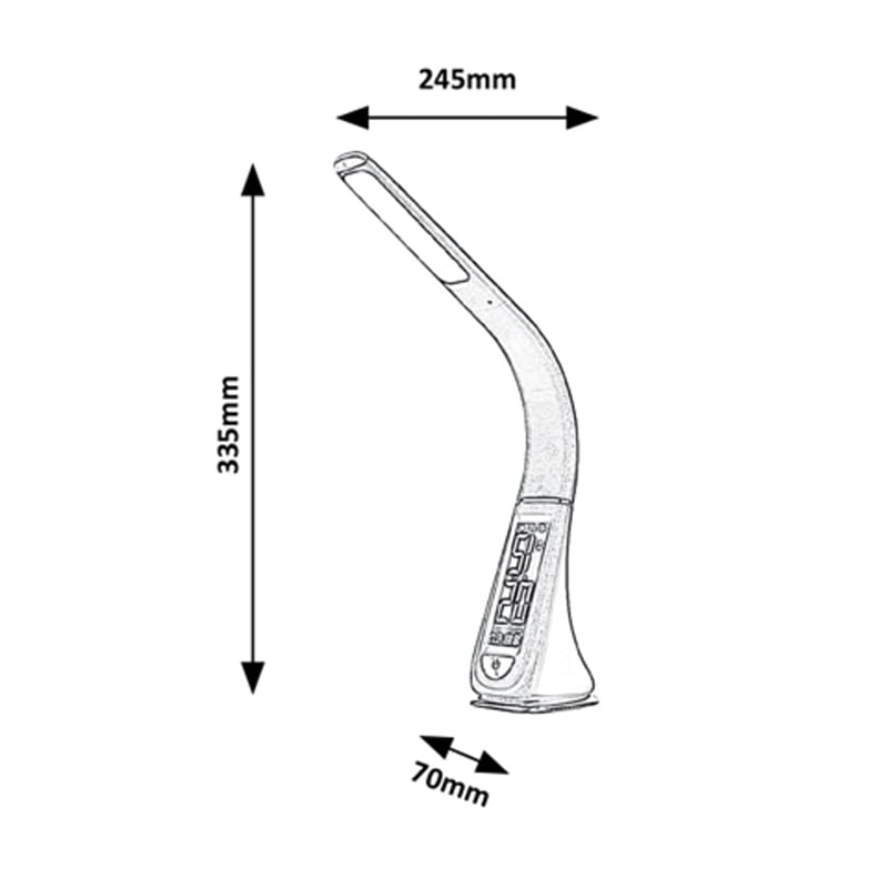 Nowoczesna lampka biurkowa Lionel dostępna w sklepie internetowym z oświetleniem lampynox.pl, świetnie sprawdzi się w gabinecie lub pokoju dziecięcym. Ten wykonany w całości z tworzywa sztucznego model z naturalnym białym światłem może zapewnić doskonałe wsparcie podczas pracy lub nauki. Jego cyfrowy wyświetlacz z wygodnym rozmiarem czcionki zapewnia łatwą czytelność. Dodatkowo, dzięki swojej konstrukcji, lampka zajmuje naprawdę mało miejsca, dzięki czemu jest praktycznym wyborem nawet przy mniejszym biurku. Ten biały model o elastycznym designie ma wbudowaną żarówkę LED o mocy 5W, strumieniu świetlnym 260 lumenów i żywotności 30 000 godzin. Źródło światła klasy energetycznej A ma temperaturę barwową 5000K. Lampkę Lionel można ściemniać, czyli regulować jej jasność za pomocą dotykowego przełącznika w dolnej części lampy. Cyfrowy wyświetlacz jest zasilany dołączoną baterią CR2032. Wymiary lampki biurkowej są następujące: szerokość ozdobnej podstawy 70mm, całkowita wysokość 335mm, ramię 245mm.