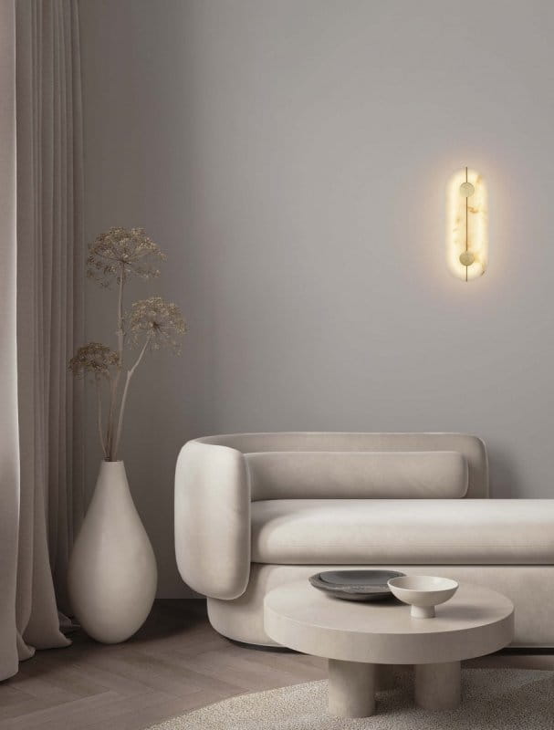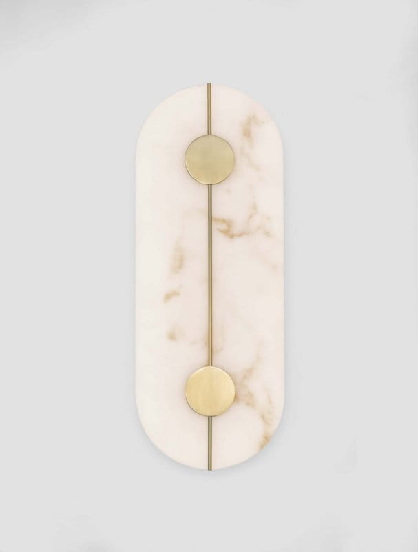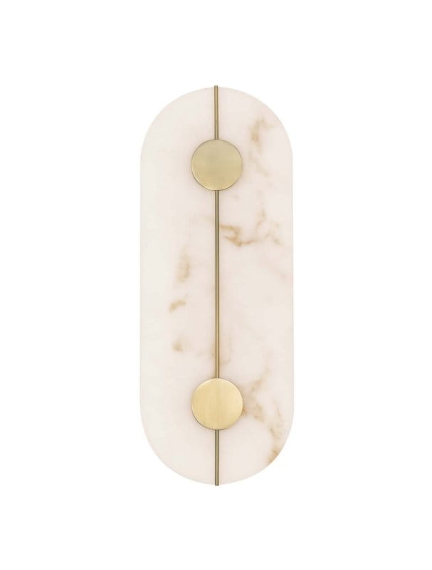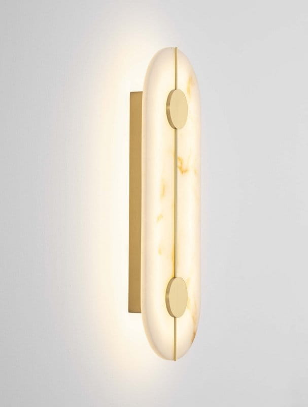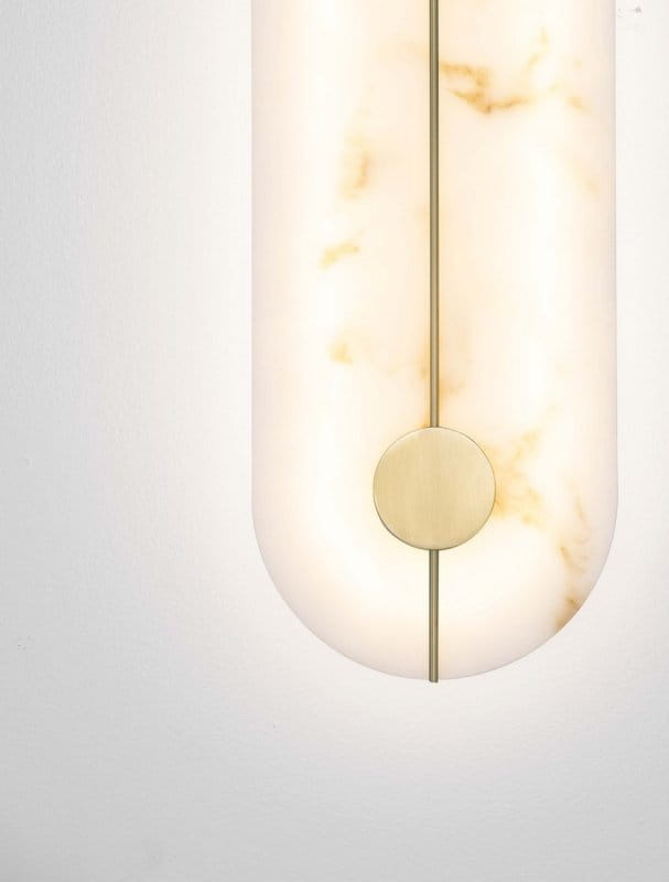 Elegancki kinkiet ścienny Luces Exclusivas MAIRANA ma niezwykły, minimalistyczny design. Jego konstrukcja składa się z owalnego panelu wykonanego z wysokiej jakości materiału imitującego alabaster, który nadaje mu luksusowy wygląd. Przez środek lampy przebiega delikatny złoty pasek, akcentowany przez dwa ozdobne, okrągłe detale w kolorze złotym. Kinkiet doskonale nadaje się jako dekoracyjne oświetlenie w salonie, sypialni czy korytarzu, tworząc wyrafinowany klimat. Idealny do aranżacji w stylu glamour, nowoczesnym lub art deco.