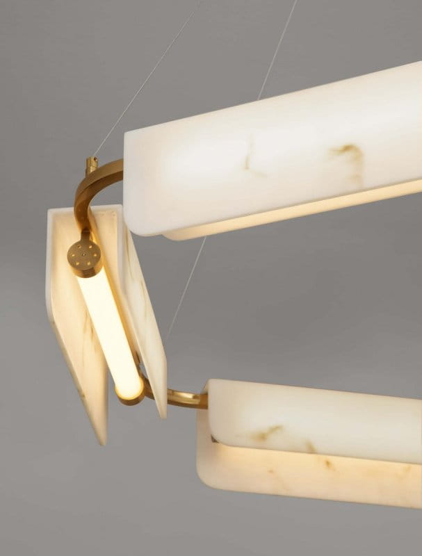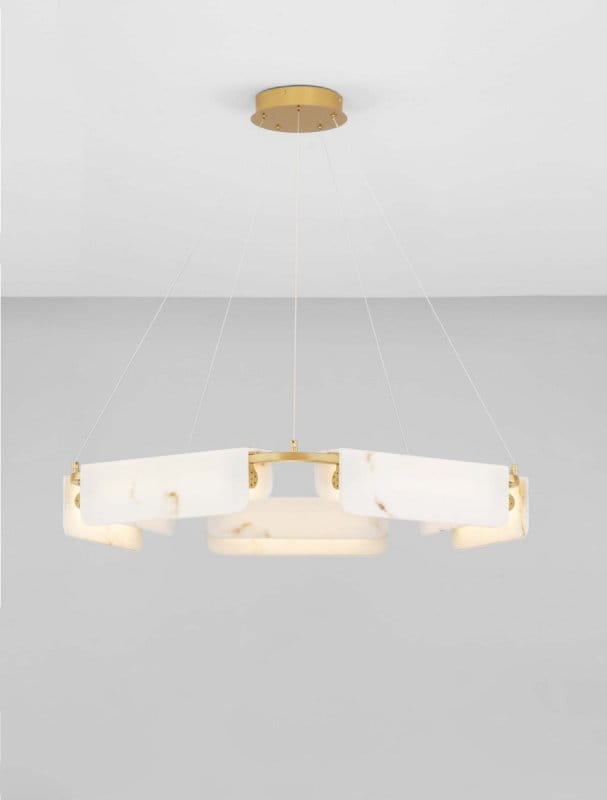 Lampa wisząca Luces Exclusivas MAIRANA o luksusowym charakterze, zaprojektowana z wykorzystaniem eleganckich materiałów. Złota, okrągła podsufitka utrzymuje na imponującą konstrukcję w kształcie pierścienia ze stali, aluminium oraz wysokiej jakości materiału imitującego alabaster,. Ozdobne elementy, ułożone w harmonijny sposób, pięknie rozpraszają światło, tworząc przyjemny i nastrojowy efekt w pomieszczeniu. Złote detale dodają całości wyrafinowanego stylu, czyniąc lampę idealnym wyborem do reprezentacyjnych wnętrz, takich jak salony, jadalnie czy przestrzenie hotelowe. Doskonała dla miłośników nowoczesnego designu z nutą elegancji. Możliwość ściemniania za pośrednictwem systemu TRIAC.