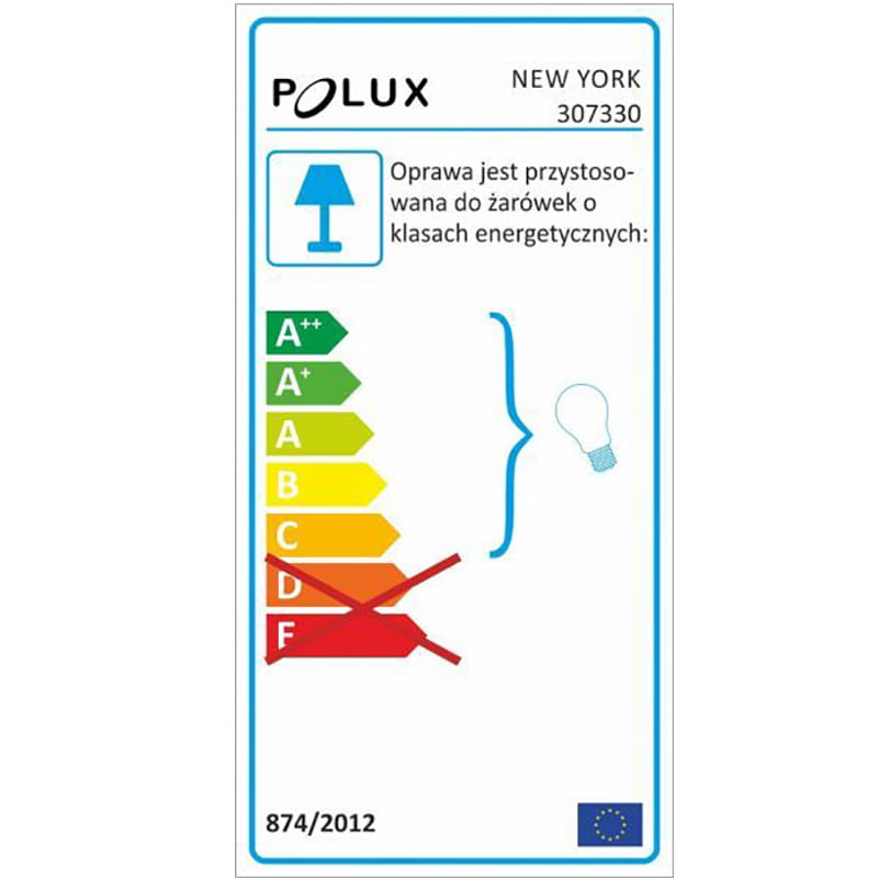 Klasa energetyczna produktu: Oprawa jest przystosowana do żarówek o klasach energetycznych: A++, A+, A,B,C