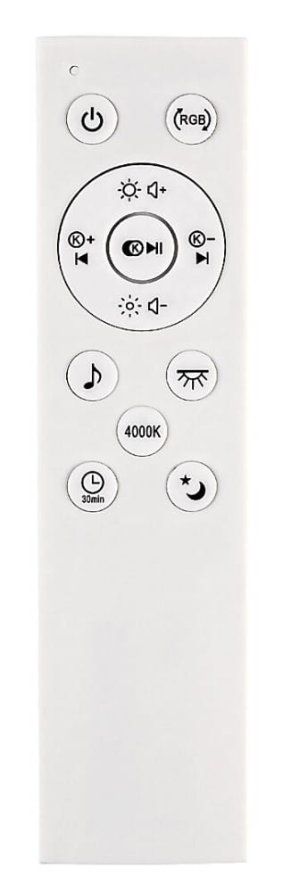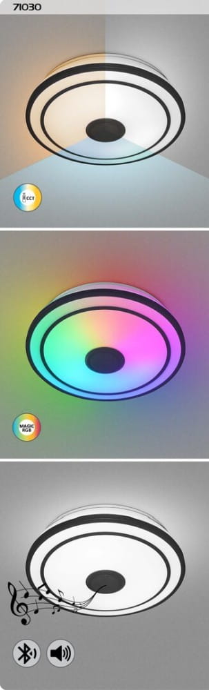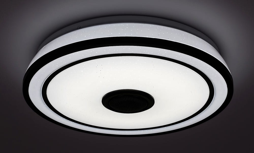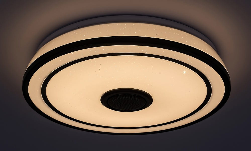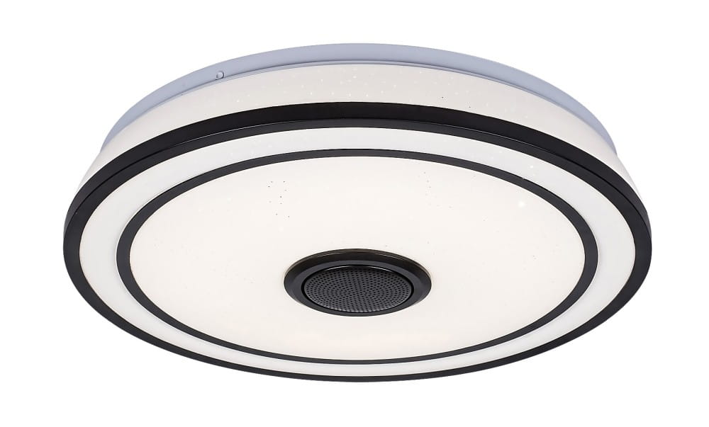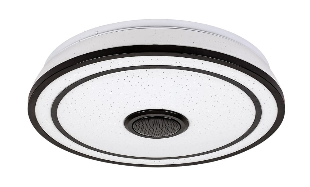 Okrągła oprawa sufitowa Nikolaus ze lśniącymi efektami to oprawa smart spełniająca każde wymagania, która będzie pasować do każdego nowoczesnego salonu lub sypialni. Wykonana z metalu czarna oprawa uzupełniona białym kloszem z tworzywa sztucznego posiada wbudowane źródło światła LED klasy energetycznej G o mocy 24 W, strumieniu świetlnym z kloszem - 1600 lumenów, bez klosza - 2400 lumenów. Trwałość źródła światła jest fantastyczna: 50.000 godzin! Istnieje możliwość regulacji temperatury barwowej oprawy w zakresie od 3000 do 6500K, co oznacza, że oprawa może emitować ciepło białe, naturalne lub białe zimne światło. Dodatkowe funkcje oprawy to regulowana jasność, światło RGB, pamięć, timer, funkcja światła nocnego. I to nie wszystko: oprawa Nikolaus posiada głośnik sterowany za pośrednictwem Bluetooth! Funkcja pamięci może być ustawiana za pomocą przełącznika lub pilota, natomiast pozostałe dodatkowe funkcje mogą być regulowane za pomocą pilota. Średnica oprawy sufitowej wynosi 395 mm, a odległość od sufitu 90 mm.