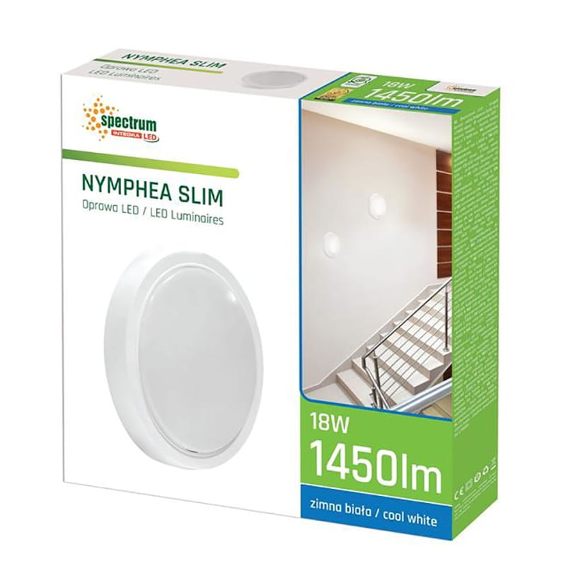 Oprawy z serii NYMPHEA SLIM charakteryzują się wysoką skutecznością świetlną do 82lm/W. Są to najcieńsze plafony dostępne na rynku: 35mm. System „click Xpress” umożliwia szybki montaż i otwieranie, mleczna przysłona równomiernie rozprasza światło. Lampy są wykonane z wysokogatunkowe PC. Oprawy można stosować w korytarzach, klatkach schodowych, garażach, holach itp.