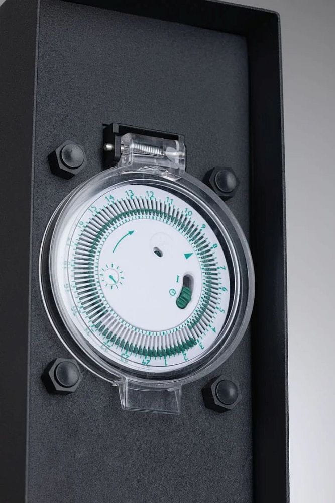 Kolumna gniazdowa Rio z zegarem służy jako rozdzielacz prądu na zewnątrz. Dzięki ochronie przed wodą rozbryzgową IP44 oraz ochronnym stykom gniazdowym doskonale nadaje się do sterowania oświetleniem ogrodowym.