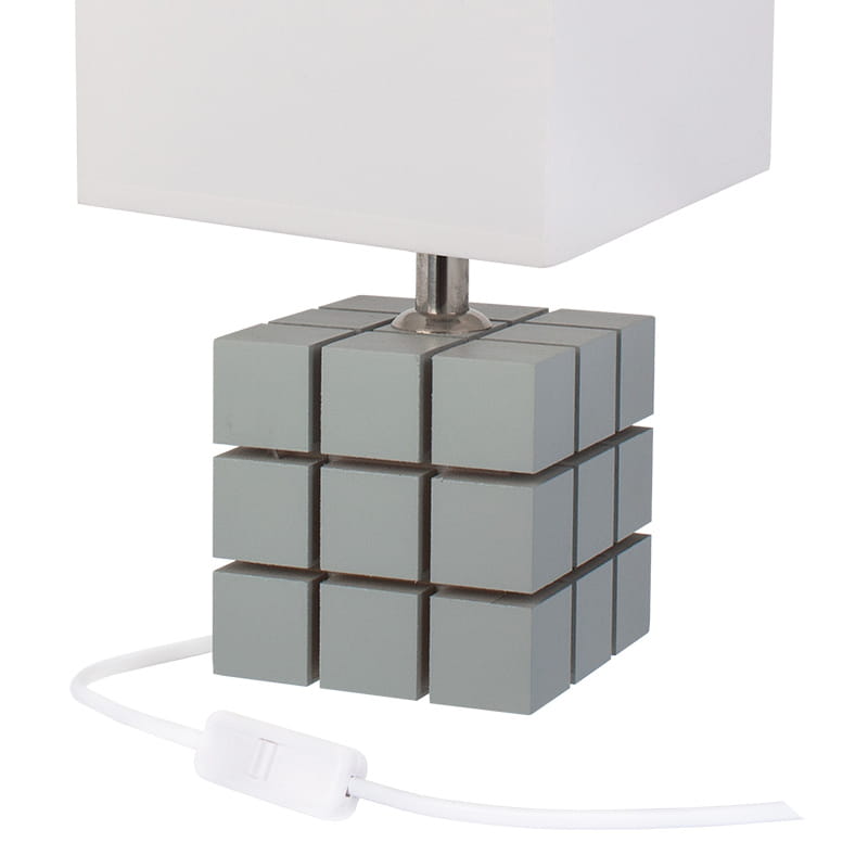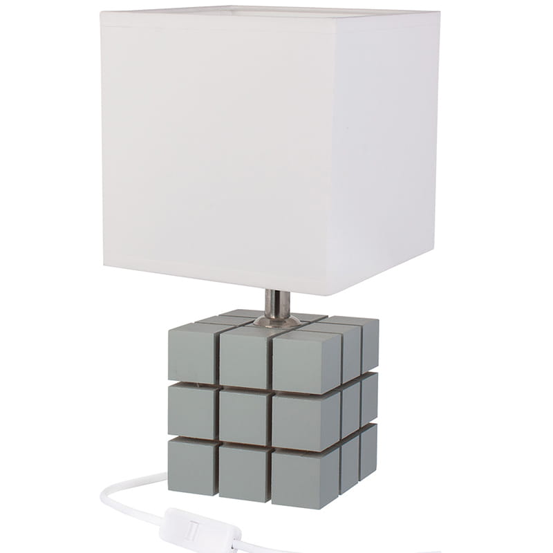 Podstawa lampki wykonana została w całości z drewna , pokryta specjalnym olejem w kolorze szarym. Uroku dodaje biały abażurek , umieszczony na metalowej rurce z stali nierdzewnej. Przewód biały o długości 150 cm z przełącznikiem. Każda mała kosteczka na dużej podstawie ma 3x3x3cm Wymiary abażuru: Długość : 16 cm Wysokość : 16 cm Szerokość : 16 cm Materiał abażurku : bawełna