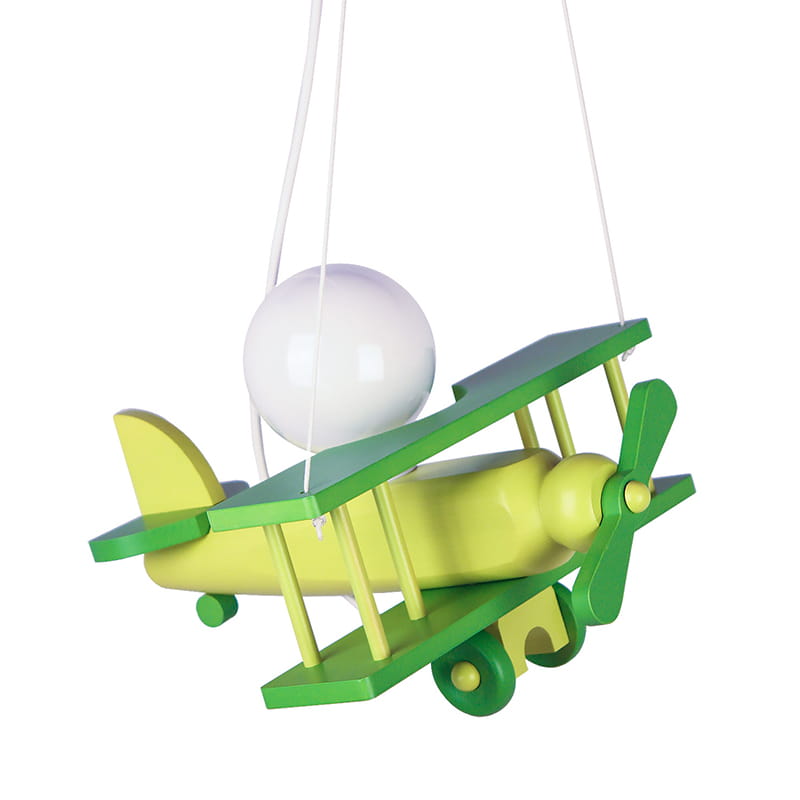 Lampka wisząca mały Samolot wykonana solidnie w całości z drewna sosnowego. Malowane w kolorze zielono - seledynowym wodną farbą posiadającą atesty bezpieczeństwa dla dzieci. W lampie dziecięcej zastosowaliśmy światło pod oprawę E27 o mocy 60W. Najlepiej sprawdzi się tutaj żarówka GLOBE o kształcie białej kuli , doda uroku lampie. Warto zastosować żarówkę o barwie ciepłej , naturalnej. Lampa dziecięca Samolot posiada regulowany przewód o długości 56-59 cm , więc bez problemu możesz dopasować wysokość lampy do swoich potrzeb. Całość lampki od podwozia, aż do podsufitki wynosi 70 cm.